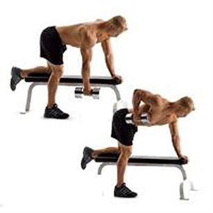 单手哑铃划船,可以使用平凳辅助,保持身体稳定,单膝跪在凳子上和一侧手臂支撑,另一手持哑铃,吸气伸展放下充分拉伸背部,呼气发力拉起哑铃,手臂尽量贴住身体,将哑铃拉至肋下。