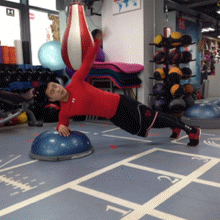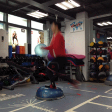 三个动作为一次循环,上肢,下肢,核心。 强度从低到高,逐步递增,每组可做12-20次,间歇时间一分钟。 (如无BOSU的可在地面上完成)可提高肌耐力,心肺功能,肌肉爆发力。